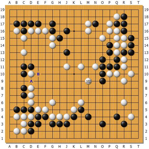 こうして改めて見ると、形勢は黒がそこそこいいように思うのですが、打っている時は互角もしくはやや悪いと思っていました。